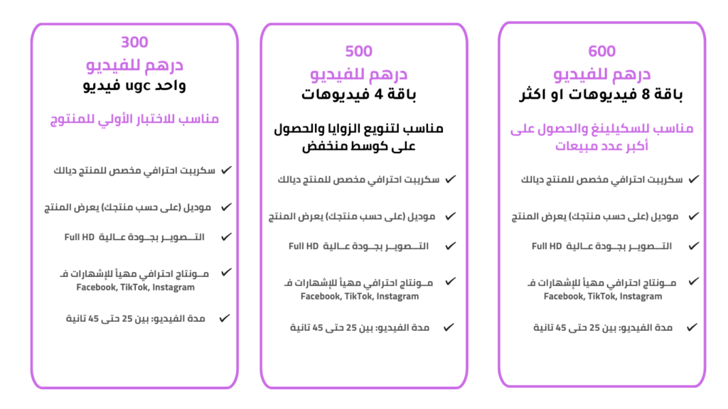 ع فيديوهات UGC، كنصوبو ليك محتوى طبيعي كيبيّن منتوجك فالحياة اليومية ديال الزبون. الهدف ديالنا هو خلق فيديوهات تقنع المشاهد بالشراء وتبرز الفائدة الحقيقية من استعمال منتوجك بطريقة بسيطة وقريبة للواقع.